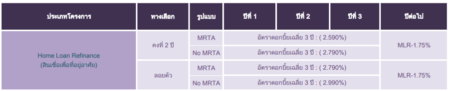 - กรณี Refinance ไปสถาบันการเงินอื่นก่อนครบ 3 ปีแรก คิดค่า Prepayment Penalty 3% ของเงินต้นคงค้าง