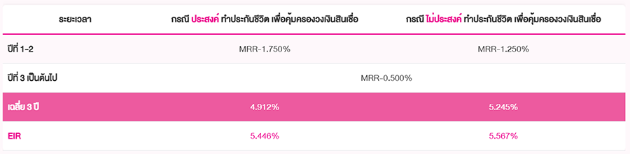 - อัตราดอกเบี้ยที่แท้จริงตลอดอายุสัญญา (EIR) คำนวณจากอัตราดอกเบี้ยโปรโมชัน วงเงินกู้ 1.00 ล้านบาท ระยะเวลาชำระเงินกู้ 20 ปี เงินงวดปีที่ 1-2 = 5,000 บาท ปีที่ 3 เป็นต้นไป = 7,800 บาท