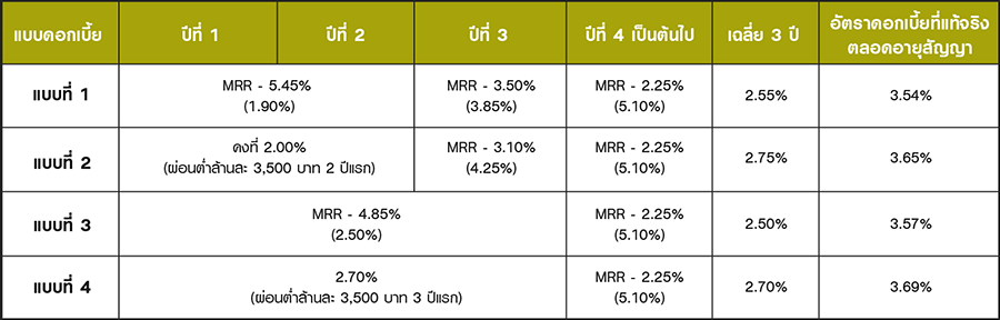 - ลูกค้าสามารถเลือกใช้อัตราการผ่อนชำระขั้นต่ำ ล้านละ 3,500 บาท กรณีเลือกอัตราดอกเบี้ยคงที่**