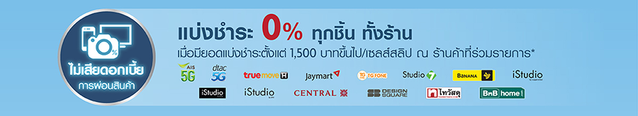- แบ่งชำระ 0% ทุกชิ้น ทั้งร้าน เมื่อมียอดแบ่งชำระตั้งแต่ 1,500 บาทขึ้นไป/เซลส์สลิป ณ ร้านค้าที่ร่วมรายการ*