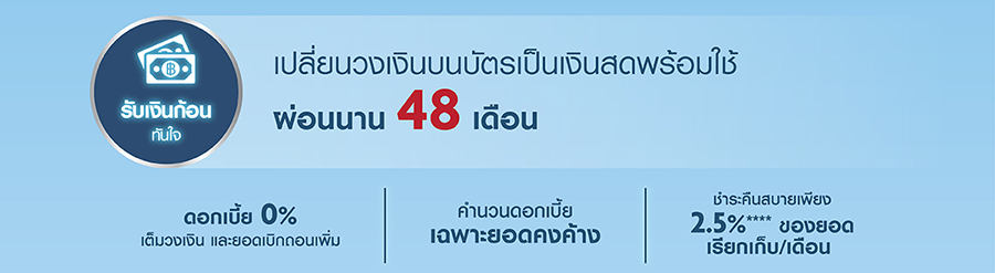 - เปลี่ยนวงเงินบนบัตรเป็นเงินสดพร้อมใช้ ผ่อนนาน 48 เดือน