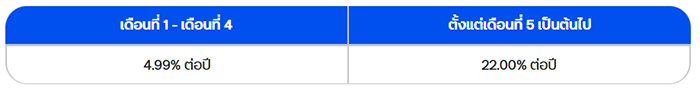 - หลังจากสิทธิ์อัตราดอกเบี้ยพิเศษครบตามระยะเวลาที่กำหนด อัตราดอกเบี้ยในรอบบัญชีถัดจากเดือนที่ครบกำหนด จะถูกปรับเป็นอัตราดอกเบี้ยปกติตามประกาศธนาคาร ณ ปัจจุบัน อยู่ที่ 25% ต่อปี โดยคำนวนตามจำนวนเงินที่เบิกใช้ หรือจำนวนเงินคงค้างในแต่ละรอบบัญชี
