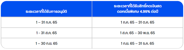 - ลูกค้าที่เข้าร่วมโครงการ ต้องเป็นลูกค้าใหม่ที่สมัคร และได้รับอนุมัติบัตรกดเงินสด ttb flash ระหว่างวันที่ 1 ก.ค. 65 – 30 ก.ย.65 ลูกค้าที่เข้าร่วมโครงการตามเงื่อนไขข้างต้น มีสิทธิ์ได้รับข้อเสนอกดเงินสดดอกเบี้ยพิเศษ 4.99% ต่อปี เมื่อสมัครบัตรกดเงินสด ttb flash ระหว่างวันที่ 1 ก.ค. 65 – 30 ก.ย.65 และได้รับการอนุมัติตามช่วงเวลา ดังนี้