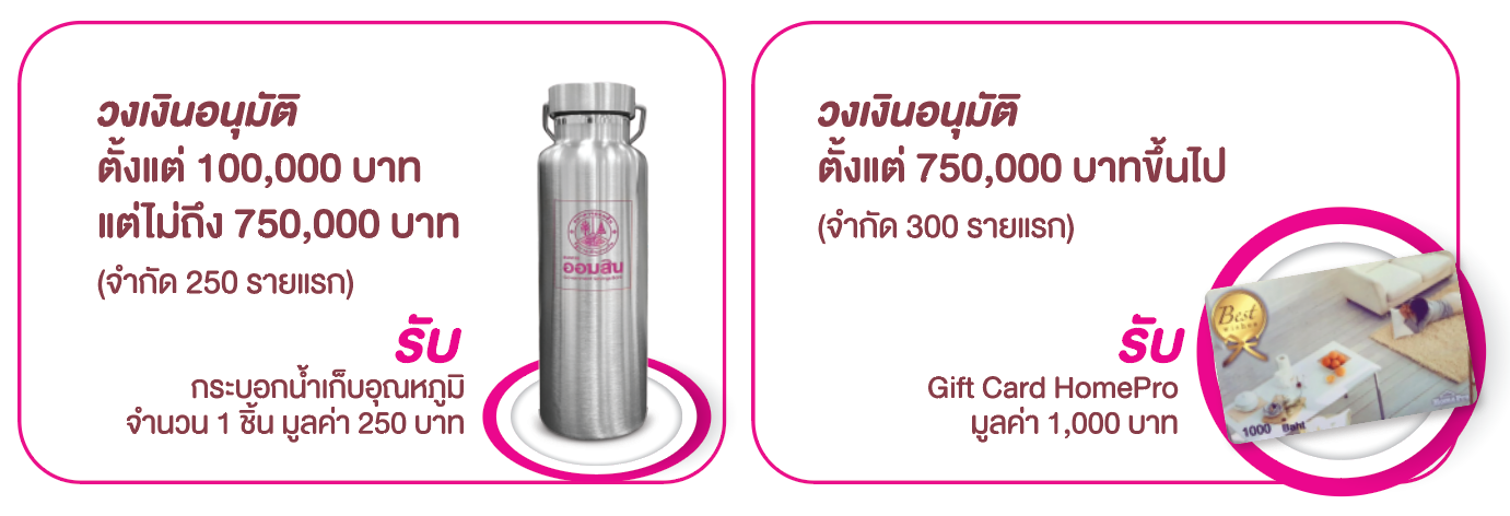 เฉพาะลูกค้ารายใหม่ สินเชื่อสวัสดิการ สำหรับข้าราชการบำนาญและลูกจ้างประจำโดยใช้บำเหน็จตกทอดเป็นหลักประกัน รับของสมนาคุณดังนี้