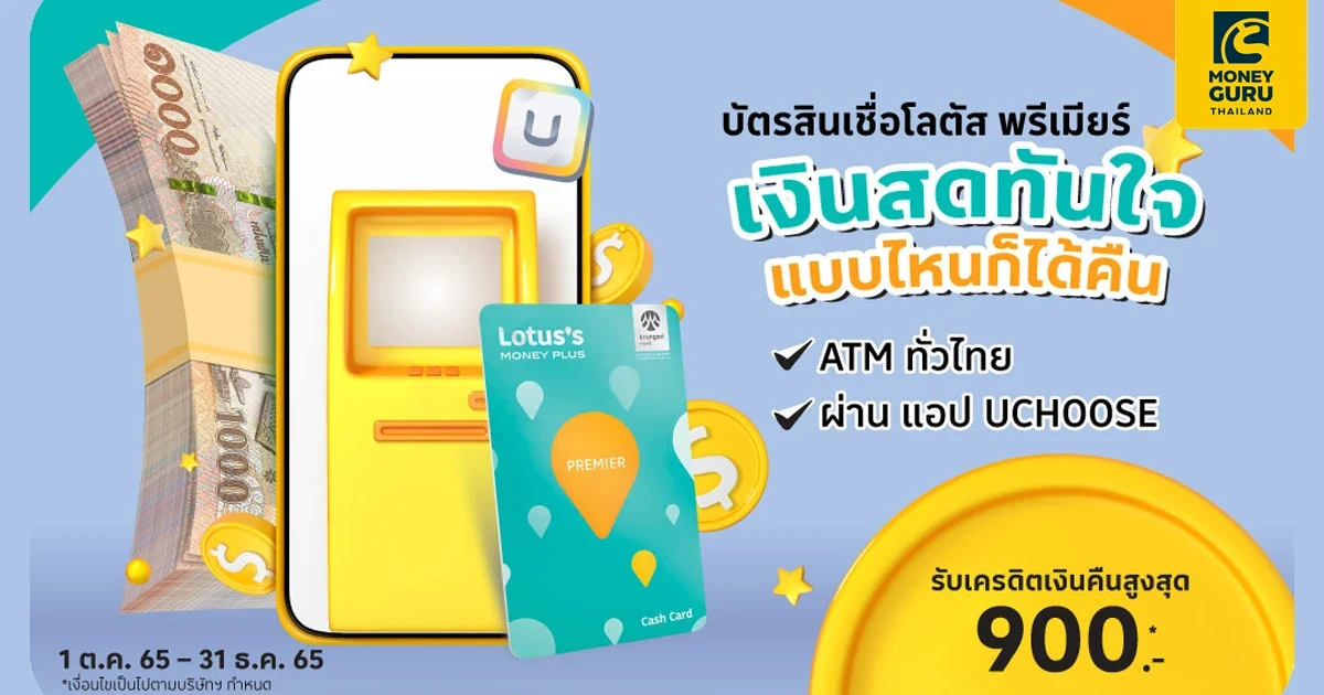 รับเครดิตเงินคืนสูงสุด 900 บาท* เมื่อเบิกถอนเงินสดผ่านตู้ ATM หรือสินเชื่อเงินสดโอนเข้าบัญชีผ่านแอป UCHOOSE รับเครดิตเงินคืนตามที่กำหนด