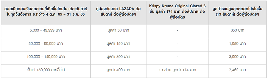 เมื่อทำรายการเบิกถอนเงินสดผ่านบัตรยูโอบี แคชพลัส (Cash Plus) ที่ตู้ ATM ของทุกธนาคารทั้งในและต่างประเทศ หรือผ่านสาขาธนาคารยูโอบี หรือผ่านแอปพลิเคชัน UOB TMRW เข้าบัญชีเงินฝากยูโอบี ในทุกวันอังคาร ระหว่างวันที่ 4 ตุลาคม 2565 – 31 ธันวาคม 2565 รับคูปองส่วนลด LAZADA และรับ Krispy Kreme ตามรายละเอียดที่ระบุในตารางด้านล่างนี้