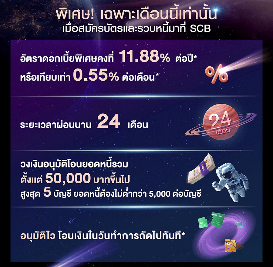 - สำหรับลูกค้าที่สมัครบัตรกดเงินสด SCB Speedy Cash รายใหม่ (ยกเว้น Speedy Cash Up2Me , Speedy Cash e-Card และ SCB M Speedy Cash) พร้อมสมัครใช้บริการโอนยอดหนี้ของบัตรเครดิต หรือบัตรกดเงินสด หรือ สินเชื่อบุคคลของสถาบันการเงินอื่น ในระหว่างวันที่ 1 พฤศจิกายน 2565 – 30 พฤศจิกายน 2565 และได้รับอนุมัติบัตรภายในวันที่ 9 ธันวาคม 2565 เท่านั้น