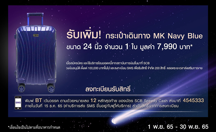 - สำหรับลูกค้าที่สมัครบัตรกดเงินสด SCB Speedy Cash รายใหม่ ( ยกเว้น Speedy Cash Up2Me , Speedy Cash e-Card และ SCB M Speedy Cash) พร้อมสมัครใช้บริการโอนยอดหนี้ของบัตรเครดิต หรือบัตรกดเงินสด หรือ สินเชื่อบุคคลของสถาบันการเงินอื่น ในระหว่างวันที่ 1 พฤศจิกายน 2565 – 30 พฤศจิกายน 2565 และได้รับอนุมัติบัตรภายในวันที่ 9 ธันวาคม 2565 วงเงินอนุมัติ 100,000 บาท ขึ้นไป รับกระเป๋าเดินทาง MK Navy Blue ขนาด 24 นิ้ว จำนวน 1 ใบ มูลค่า 7,990 บาท จำกัดสิทธิ์ จำนวน 200 สิทธิ์ ตลอดระยะเวลาส่งเสริมการขาย