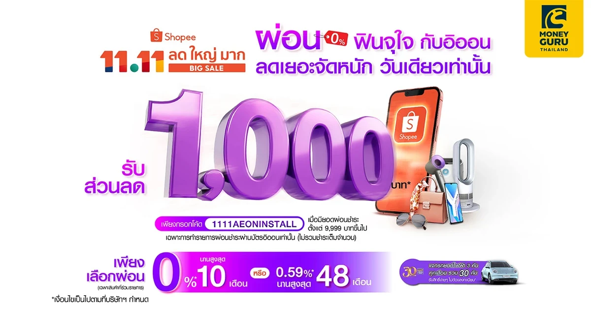 Shopee 11.11 ผ่อนสินค้าออนไลน์กับอิออน ที่ Shopee 0% นานสูงสุด 10 เดือนหรือผ่อนยาว 48 เดือน ดอกเบี้ย 0.59% ต่อเดือน รับส่วนลด 1,000 บาท เมื่อมียอดผ่อนชำระสินค้าที่ Application Shopee ครบ 9,999 บาทขึ้นไป