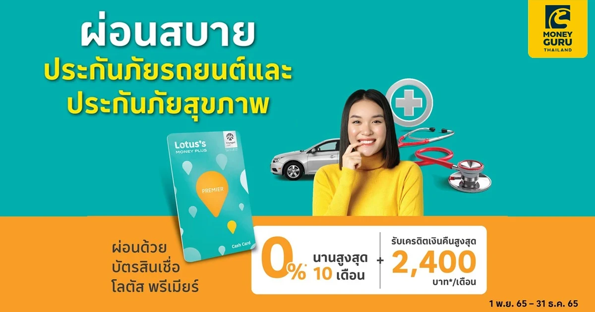 บัตรสินเชื่อโลตัส พรีเมียร์ผ่อนประกันภัยที่ร่วมรายการ 0%* นานสูงสุด 10 เดือน ที่เคาน์เตอร์โลตัส มันนี่ พลัส หรือผ่านช่องทาง Call center 02-627-8888