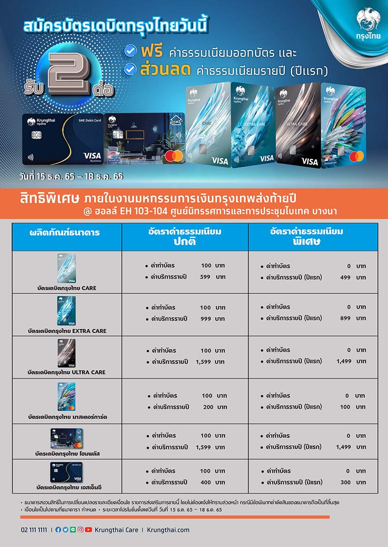 บัตรเดบิตกรุงไทย : สมัครบัตรเดบิตกรุงไทยวันนี้ ฟรีค่าธรรมนียมออกบัตร และส่วนลดค่าธรรมเนียมรายปี (ปีแรก) พร้อมรับอัตราค่าธรรมเนียมพิเศษภายในงาน