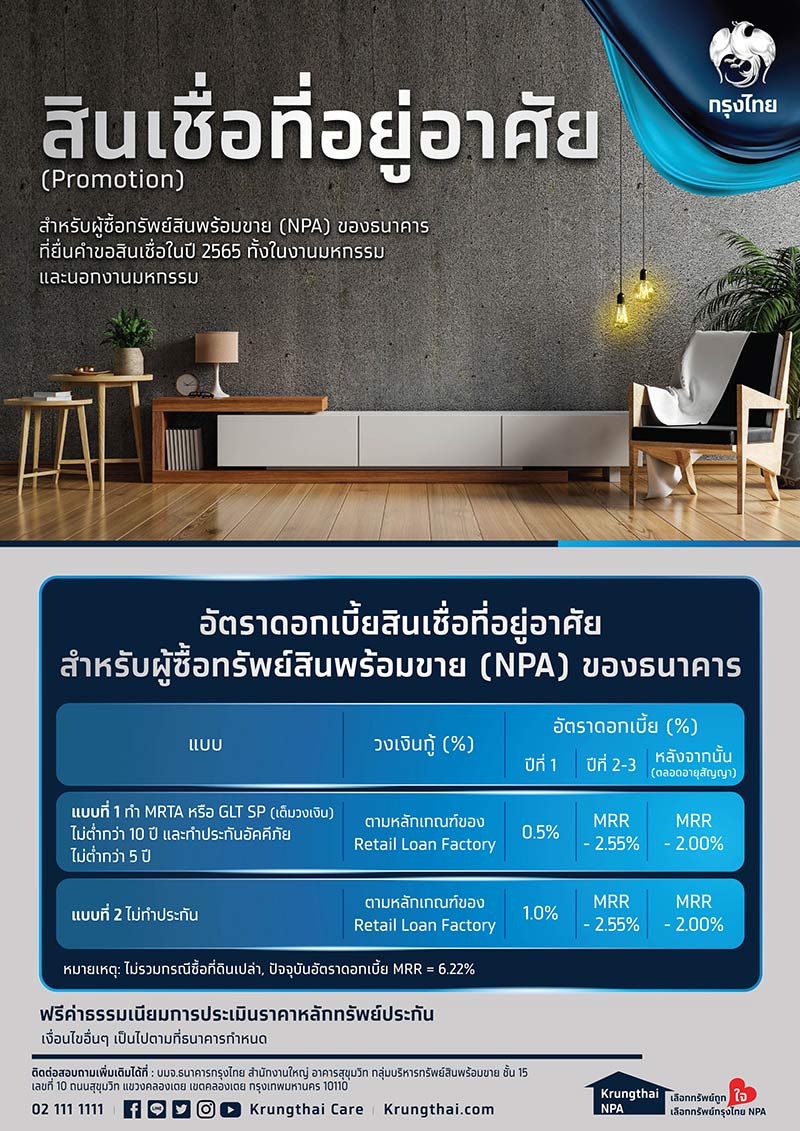 สินเชื่อที่อยู่อาศัย : สำหรับผู้ซื้อทรัพย์สินพร้อมขาย (NPA) ของธนาคาร ที่ยื่นคำขอสินเชื่อในปี 2565 ทั้งในงานมหกรรมและนอกงานมหกรรม รับอัตราดอกเบี้ยพิเศษ