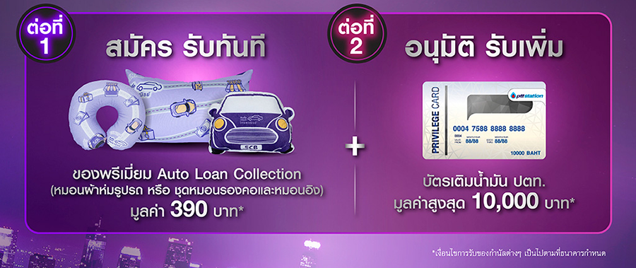 โดยลูกค้าสามารถศึกษาเงื่อนไขและรายละเอียดการใช้บัตรเติมน้ำมัน ปตท. ตามที่ระบุไว้บนบัตร ทั้งนี้ธนาคารจะจัดส่งบัตรเติมน้ำมัน ปตท. ให้ลูกค้าตามที่อยู่ที่ลูกค้าระบุไว้ในใบสมัครสินเชื่อเช่าซื้อรถยนต์ ภายใน 60 วัน นับจากวันที่ลูกค้าออกรถ