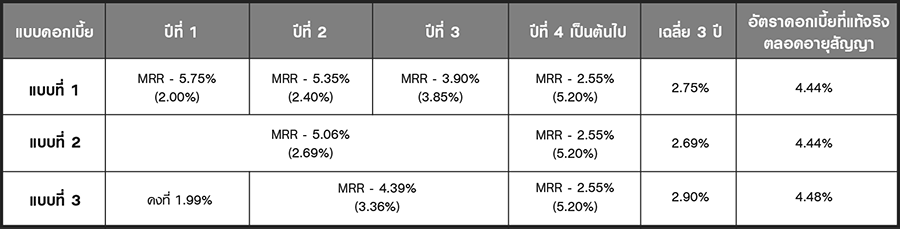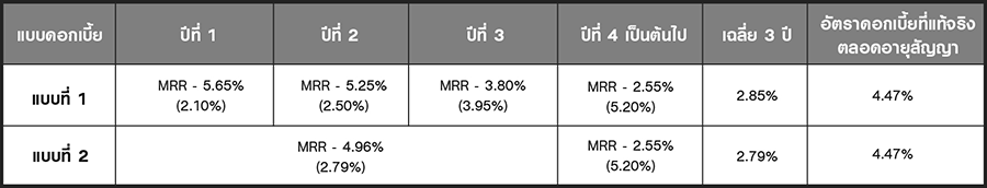 - อัตราดอกเบี้ยที่แท้จริงข้างต้นเป็นเพียงตัวอย่างอัตราดอกเบี้ยสำหรับสินเชื่อที่อยู่อาศัยวงเงิน 3 ล้านบาท อายุสัญญา 10 ปี MRR = 7.75% (ณ วันที่ 19 ต.ค. 65) ที่คำนวณตามเงื่อนไขที่ใช้ในโฆษณาฉบับนี้เท่านั้น ซึ่งอาจมีความแตกต่างตามเงื่อนไขการกู้ยืมของลูกค้าแต่ละราย