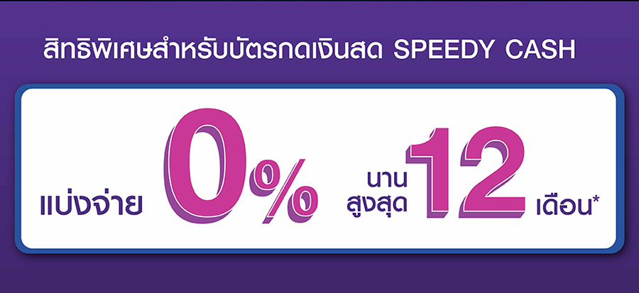 สิทธิพิเศษสำหรับผู้ถือบัตร Speedy Cash เเบ่งจ่าย 0% นานสูงสุด 12 เดือน*