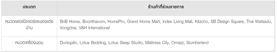 - แบ่งชำระ 0% 6 เดือน: BnB Home, Boonthavorn, Grand Home Mart, Index Living Mall, Kitzcho, SB Design Square, Thai Watsadu, Vongchai, V&H International