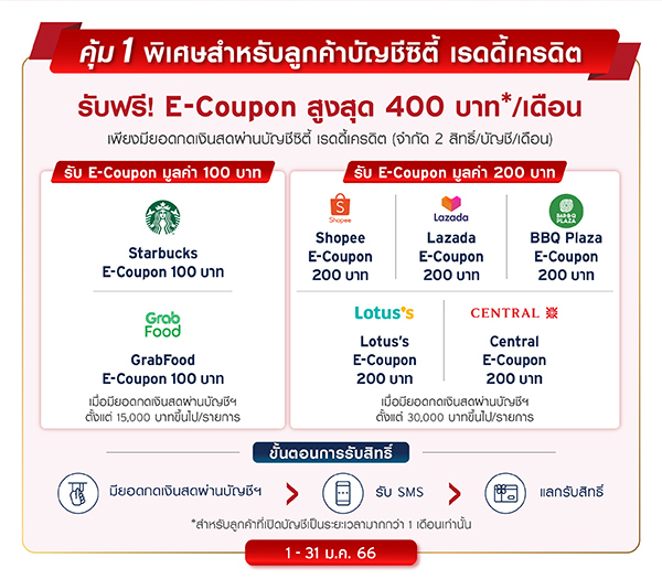 - เมื่อมีการทำรายการที่กำหนด E-Coupon จะถูกจัดส่งไปยังเบอร์โทรศัพท์มือถือที่ลงทะเบียนไว้กับทางธนาคารภายใน 5 วันทำการ