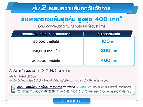 - สมาชิกฯจะได้รับเครดิตเงินคืน 100/200/400 บาท เมื่อมียอดกดเงินสดสะสม ณ วันอังคารที่ร่วมรายการรวมกันในเดือนไม่ต่ำกว่า 80,000/150,000/300,000 บาท ตามลำดับ และทำการคงยอดกดเงินสดจำนวนดังกล่าวไว้ในบัญชีฯ อย่างน้อย 1 วัน