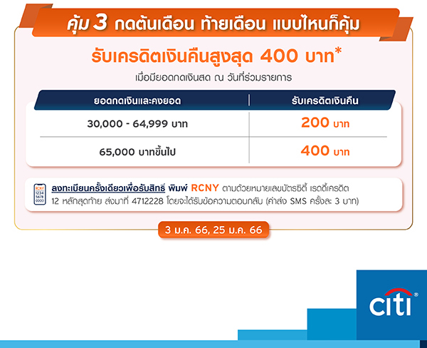 รับความสุขฉลองปี 66 กับซิตี้ เรดดี้เครดิต เมื่อกด- ใช้-สะสมยอด รับโปรโมชัน 3 ต่อ และสิทธิประโยชน์มูลค่า 1,600 บาท ดังนี้