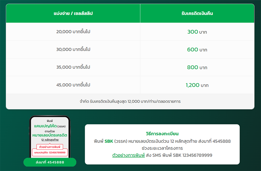- วิธีลงทะเบียน: สงวนสิทธิ์เฉพาะผู้ถือบัตร Xpress Cash ที่ลงทะเบียนเข้าร่วมโครงการ ผ่าน SMS พิมพ์ SBK (เว้นวรรค) ตามด้วยหมายเลขบัตรเงินด่วน 12 หลักสุดท้าย ส่งมาที่ 4545888 ตั้งแต่วันที่ 1 ก.พ. 66 – 30 เม.ย. 66 เท่านั้น