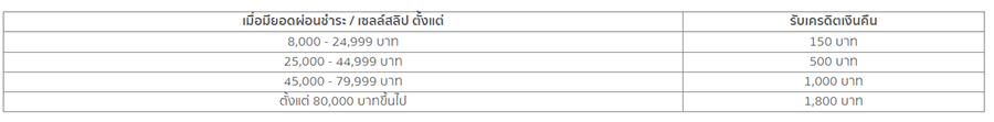- ยอดผ่อนชำระแต่ละรายการไม่สามารถนำมาสะสมหรือรวมกันได้ โดยจะคำนวณเครดิตเงินคืนต่อเซลล์สลิป