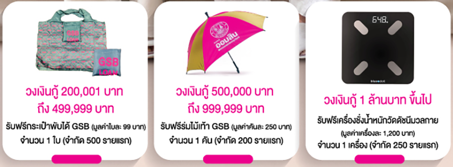 - ได้รับ กระเป๋าพับได้ GSB จำนวน 1 ใบ มูลค่าใบละ 99 บาท (จำกัด 500 รายแรก)