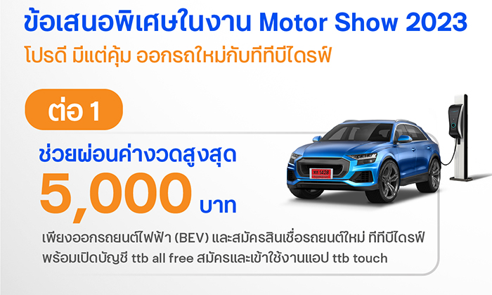 ออกรถยนต์ไฟฟ้า (BEV) กับสินเชื่อรถยนต์ใหม่ทีทีบีไดรฟ์ รับโปรช่วยผ่อนชำระค่างวดสินเชื่อรถยนต์คนละครึ่ง จำนวน 1 งวด สูงสุดไม่เกิน 5,000 บาท(เฉพาะยี่ห้อและรุ่นย่อยที่ร่วมรายการจาก Authorized Dealer ตัวแทนจำหน่ายรถยนต์อย่างเป็นทางการ เท่านั้น)