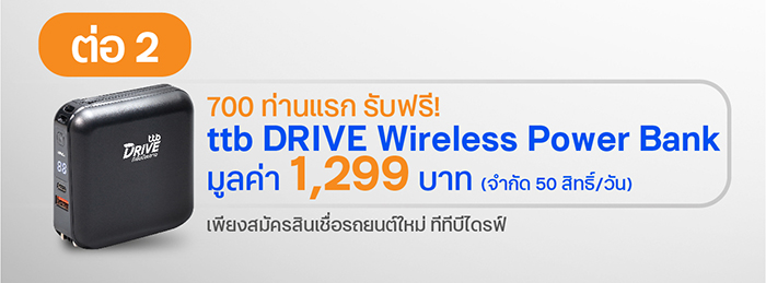 เพียงสมัครสินเชื่อรถยนต์ใหม่ทีทีบีไดรฟ์ภายในงาน(ยกเว้นยี่ห้อ GWM) รับของสมนาคุณ แบตเตอรี่สำรอง (Wireless Power Bank) มูลค่า 1,299 บาท ขนาดความจุ 10,000 mAh สีดำ ที่บูธทีทีบีไดรฟ์ จำนวน 700 ท่านแรก (จำกัด 50 สิทธิ์/วัน)