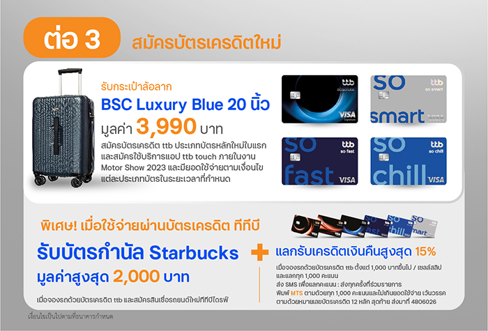 - สำหรับผู้ที่สมัครบัตรเครดิตที่บูทรับสมัครบัตรเครดิต ของบริษัท ทีทีบี คอนซูมเมอร์ จำกัด โดยมียอดใช้จ่ายสะสมผ่านบัตร ตั้งแต่ 5,000 บาทขึ้นไป ตามที่ธนาคารกำหนด และสมัครใช้บริการแอป ttb touch ภายใน 30 วันหลังจากบัตรเครดิตได้รับการอนุมัติ และคงสถานะบัตรเครดิตเป็นปกติจนถึงวันที่ธนาคารมอบ กระเป๋าเดินทาง ล้อลาก BSC Luxury Blue ขนาด 20 นิ้ว มูลค่า 3,990 บาท จำนวน 1 ใบ