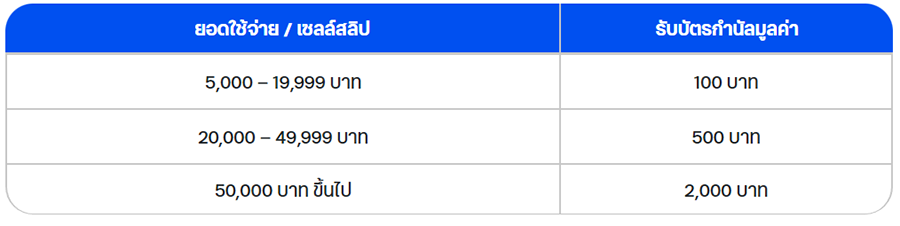 เมื่อใช้จ่าย 1,000 บาทขึ้นไป/เซลล์สลิปและแลกคะแนนสะสมทุก 1,000 คะแนน โดยไม่เกินยอดใช้จ่าย