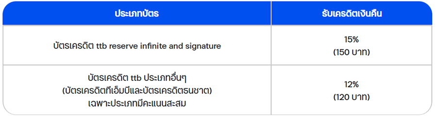 - ใช้คะแนนสะสม ttb rewards ทุกๆ 1,000 คะแนน และต้องไม่เกินยอดใช้จ่าย แลกรับเครดิตเงินคืน สำหรับบัตรเครดิต ttb reserve infinite และ บัตรเครดิต ttb reserve signature รับเครดิตเงินคืน 150 บาท และสำหรับบัตรเครดิต ttb บัตรเครดิตทีเอ็มบี และบัตรเครดิตธนชาต ประเภทที่มีคะแนนสะสม รับเครดิตเงินคืน 120 บาท โดยจำกัดการแลกคะแนนสะสมสูงสุด 100,000 คะแนน / บัญชีบัตรหลัก / ตลอดรายการส่งเสริมการขาย ทั้งนี้การแลกคะแนนสะสมต้องไม่เกินยอดใช้จ่ายต่อเซลล์สลิป โดยมียอดใช้จ่ายขั้นต่ำ 1,000 บาทขึ้นไป / เซลล์สลิป ระบบจะคำนวณเฉพาะบัตรหลักที่มีการลงทะเบียนเท่านั้น