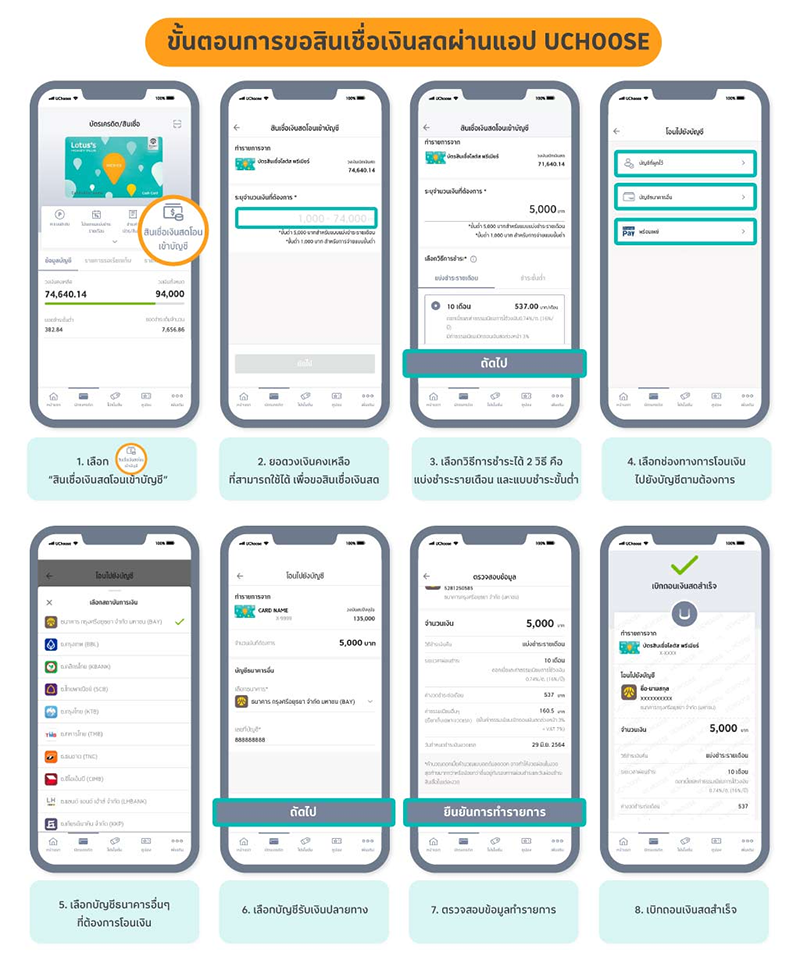 - เครดิตเงินคืนจะถูกคำนวณจากยอดเบิกถอนเงินสด ผ่านตู้ ATM หรือสินเชื่อเงินสดโอนเข้าบัญชีผ่านแอป UCHOOSE (UCash) เท่านั้น ยกเว้นรายการเงินด่วนโทรสั่งทันใจ (Hello Cash) และบริการเงินด่วนสั่งได้ (Premier Flexi)