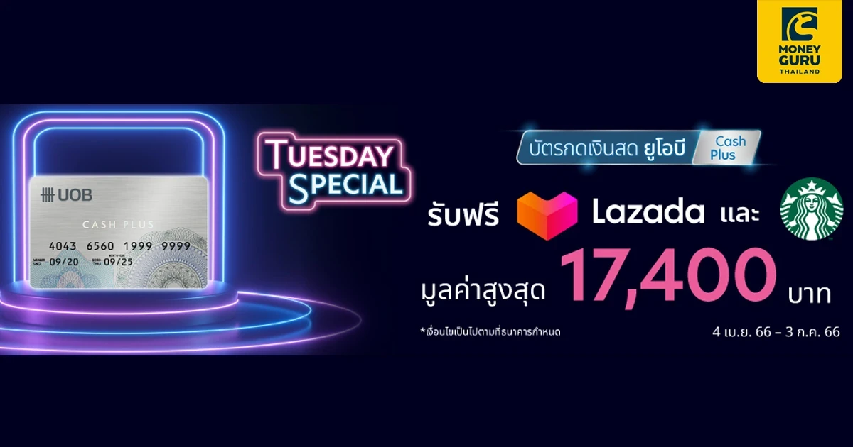 รับคูปองส่วนลด LAZADA และ Starbucks e-Coupon ฟรี มูลค่ารวมมากกว่า 17,400 บาท เพียงมีรายการเบิกถอนเงินสดผ่านบัตรยูโอบี แคชพลัส (Cash Plus) ในทุกวันอังคาร ระหว่างวันที่ 4 เมษายน 2566 - 3 กรกฎาคม 2566