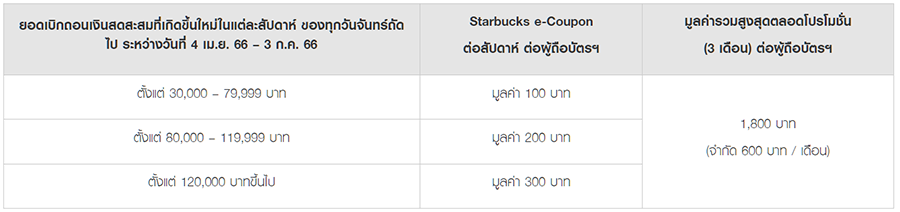- จำกัดการรับ Starbucks e-Coupon สูงสุด 600 บาท / ผู้ถือบัตรฯ / เดือน และจำกัดการรับ Starbucks e-Coupon รวมสูงสุด 1,800 บาท / ผู้ถือบัตรฯ / ตลอดรายการส่งเสริมการขาย