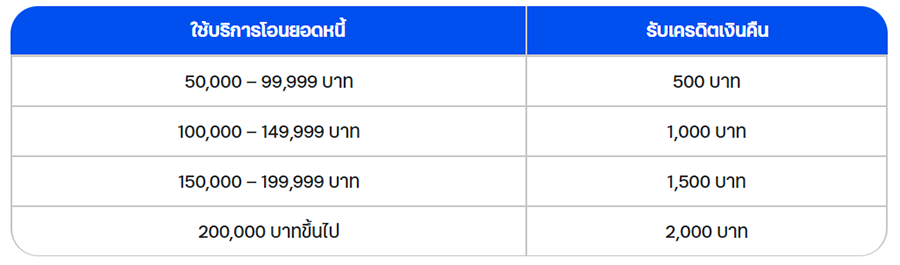โปรโมชันพิเศษ รับเครดิตเงินคืนเข้าบัญชีสูงสุดถึง 2,000 บาท เมื่อใช้บริการโอนยอดหนี้ตามเงื่อนไขที่กำหนด