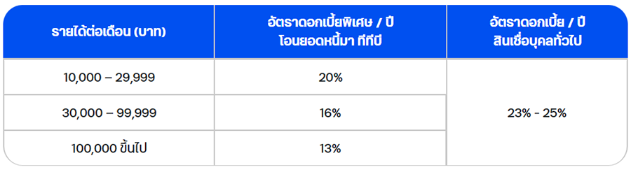 - อัตราดอกเบี้ยพิเศษคงที่ เริ่มต้น 13%ต่อปี นานสูงสุด 99 เดือน* หลังจากนั้นอัตราดอกเบี้ย 25% ต่อปี