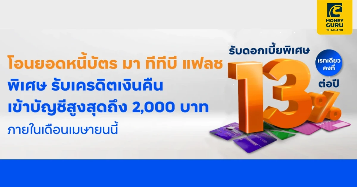 - สิทธิอัตราดอกเบี้ยพิเศษนี้ ลูกค้าจะต้องสมัครบัตร ทีทีบี แฟลช พร้อมกับสมัครใช้บริการโอนยอดหนี้ ระหว่างวันที่ 1 เม.ย. 66 - 30 เม.ย. 66 และได้รับอนุมัติภายใน วันที่ 30 เม.ย. 66 เท่านั้น