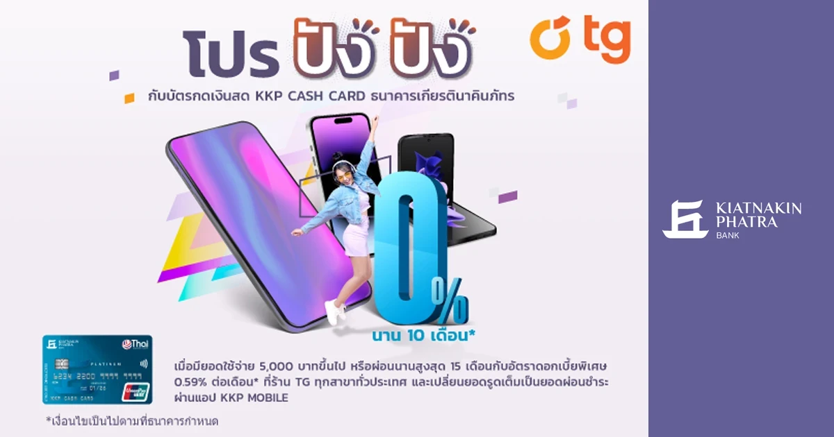 - สิทธิพิเศษสำหรับผู้ถือบัตรกดเงินสด KKP CASH CARD รับสิทธิ์การผ่อนชำระมือถือทุกรุ่นที่ร้าน TG Fone ทุกสาขาทั่วประเทศ ตลอดระยะเวลารายการส่งเสริมการตลาดเท่านั้น