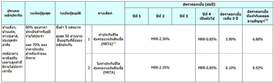 - ไม่เกิน 70 ปี สำหรับผู้กู้ที่มีรายได้เป็นเงินเดือนประจำทั่วไป และ หน่วยงานราชการและรัฐวิสาหกิจ (GOVERNMENT SECTOR)