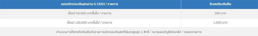 - บริษัทฯ ขอสงวนสิทธิ์ในการให้เครดิตเงินคืน และ กระเป๋าเดินทางล้อลาก เฉพาะสมาชิกที่มียอดเบิกถอนเงินสดผ่าน U CASH ตามเงื่อนไข (ยกเว้น รายการที่ถูกยกเลิก) ภายในระยะเวลาที่ร่วมรายการ และเกิดขึ้นหลังจากลงทะเบียนเรียบร้อยสมบูรณ์ รวมทั้งจะต้องมียอดคงค้างในวันสรุปยอดบัญชีตั้งแต่ 30,000 บาท ขึ้นไปอย่างน้อย 2 รอบบัญชีหลังจากวันที่ลงทะเบียนรับสิทธิ์และมีรายการเบิกถอนเงินสดผ่าน U CASH รายการแรก