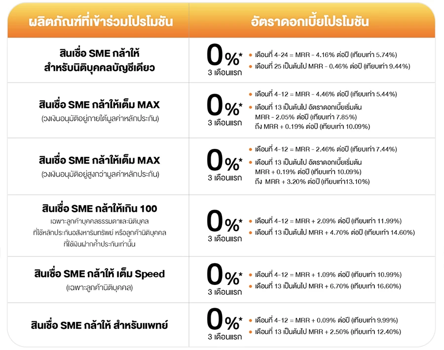 *โปรโมชันเฉพาะสินเชื่อ SME, กล้าให้เต็ม Max, สินเชื่อ SME กล้าให้เกินร้อย, สินเชื่อ SME กล้าให้สำหรับแพทย์, สินเชื่อ SME ให้เต็ม Speed (เฉพาะลูกค้านิติบุคคล), สินเชื่อ SME กล้าให้สำหรับนิติบุคคลบัญชีเดียว