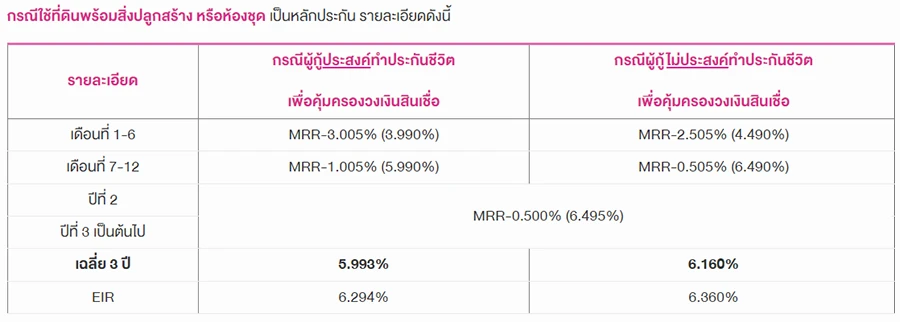 - อัตราดอกเบี้ย 6 เดือนแรก 3.99% (MRR-3.005%)