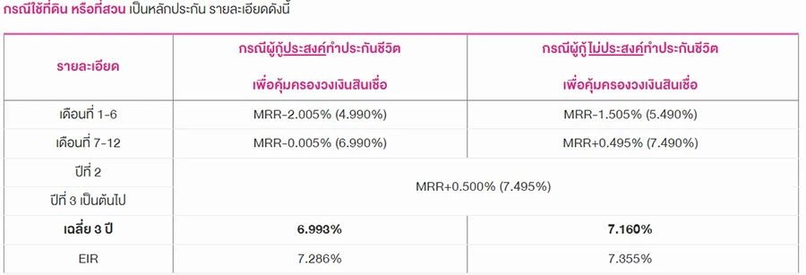 - อัตราดอกเบี้ยที่แท้จริงตลอดอายุสัญญา (EIR) คำนวณจาก วงเงินกู้ 1.00 ล้านบาท ระยะเวลาชำระเงินกู้ 20 ปี