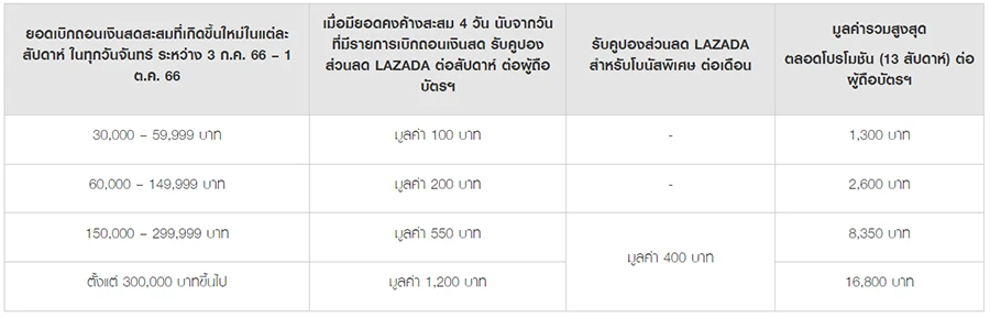 - ผู้ถือบัตรฯสามารถสะสมยอดการใช้จ่ายต่างร้านค้าได้ โดยยอดชำระรวมต้องมากกว่าหรือเท่ากับยอดขั้นต่ำที่ LAZADA กำหนด หลังหักค่าขนส่งและส่วนลดทุกประเภทและผู้ถือบัตรฯจะต้องชำระเงินเต็มจำนวนเท่านั้น