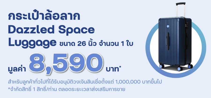 - ลูกค้าที่เป็นไปตามเงื่อนไขที่บริษัทกำหนด บริษัทจะจัดส่งกระเป๋าล้อลาก Dazzled Space Luggage ขนาด 26 นิ้ว มูลค่า 8,590 บาท จำนวน 1 ใบ ภายใน 90 วัน นับจากวันที่ได้รับการอนุมัติสินเชื่อ ผ่านช่องทางไปรษณีย์ไปยังที่อยู่ในการจัดส่งเอกสารของลูกค้าที่ได้ให้ไว้กับบริษัทตอนสมัคร
