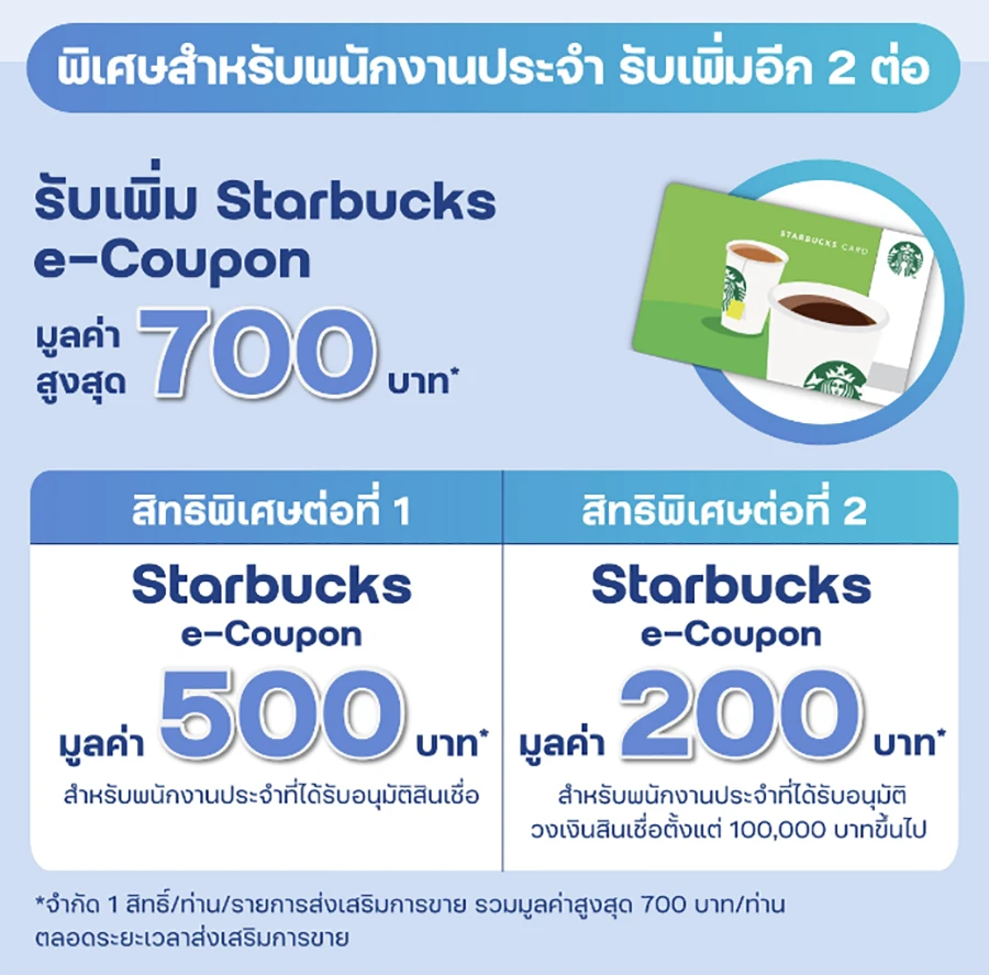 - ลูกค้า 1 ท่าน (1 บัญชีเงินกู้) จะได้รับ Starbucks e-Coupon รวมมูลค่าสูงสุด 700 บาท โดยจำกัดสิทธิพิเศษละ 1 สิทธิ์เท่านั้น ตลอดระยะเวลาส่งเสริมการขายนี้