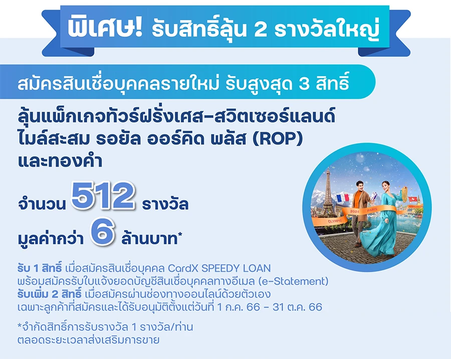 - สำหรับลูกค้ารายใหม่ที่สมัครสินเชื่อบุคคล CardX SPEEDY LOAN (ยกเว้น CardX SPEEDY LOAN Top-up และ CardX SPEEDY LOAN Balance Transfer) ในทุกช่องทาง พร้อมสมัครรับใบแจ้งยอดบัญชีสินเชื่อบุคคลผ่านอีเมล (e-Statement) และได้รับอนุมัติวงเงินสินเชื่อตั้งแต่ 1 ล้านบาทขึ้นไป ระหว่างวันที่ 1 กรกฎาคม 2566 – 30 กันยายน 2566 รับกระเป๋าล้อลาก Dazzled Space Luggage ขนาด 26 นิ้ว มูลค่า 8,590 บาท จำนวน 1 ใบ