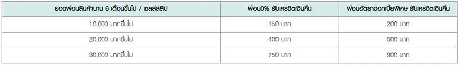 - ยอดเครดิตเงินคืนจะคำนวณจากยอดผ่อนชำระตั้งแต่ 10,000 บาทขึ้นไป/ เซลล์สลิป/ชิ้น และผ่อนชำระนาน 6 เดือนขึ้นไป เท่านั้น