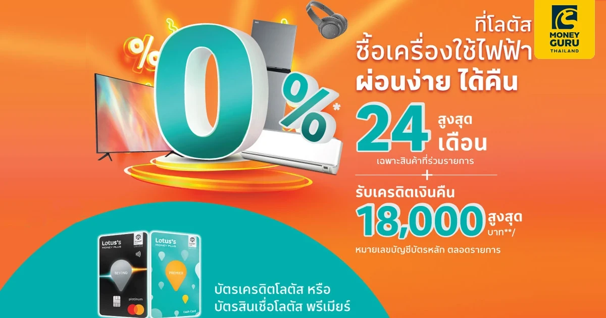 - บัตรสินเชื่อโลตัส พรีเมียร์ผ่อนชำระเครื่องใช้ไฟฟ้าอัตราดอกเบี้ย 0% นานสูงสุด 24 เดือน เฉพาะสินค้าที่ร่วมรายการ