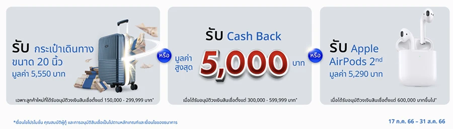 โปรโมชันพิเศษ! สมัครสินเชื่อส่วนบุคคล ผ่านช่องทางออนไลน์ รับฟรี กระเป๋าเดินทาง ขนาด 20 นิ้ว มูลค่า 5,550 บาท* หรือรับ Cash Back มูลค่าสูงสุด 5,000 บาท หรือรับ Apple AirPods 2 มูลค่า 5,290 บาท